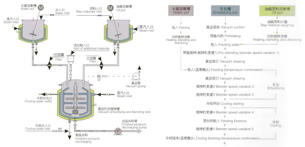 料鍋鍋蓋為自動升降式,水鍋、油鍋中的物料通過輸送管道可在真空狀態(tài)下直接吸入乳化鍋,出料方式為乳化鍋鍋體翻轉(zhuǎn)可傾式,通過電熱管對鍋夾層內(nèi)的導熱介質(zhì)進行加熱來實現(xiàn)對物料的加溫,加熱溫度任意設(shè)定,自動控制。在夾層內(nèi)接入冷卻水就可以對物料進行冷卻,操作簡單、方便,夾層外設(shè)有保溫層。均質(zhì)攪拌與槳葉攪拌可分開使用,也可同時使用。物料微粒化、乳化、混合、調(diào)勻、分散等可于短時間內(nèi)完成。與物料接觸部位采用不銹鋼(醫(yī)用采用316L材料制造,內(nèi)表面鏡面拋光,真空攪拌裝置衛(wèi)生清潔,采用符合GMP規(guī)范的衛(wèi)生標準制造)。
